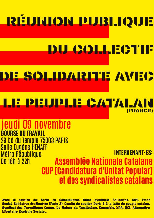 Bonjour, la préparation de la réunion publique est dans la dernière ligne droite. Interviendront une représentante de l’ANC, un de la CUP, deux jeunes du CDR ( comité de Défense d la République, créé à Paris dimanche dernier par des jeunes Catalans de Paris, un syndicaliste de TV 3, la TV publique de Catalogne menacée de reprise en main, deux représentants des Kurdes. 2 syndicalistes de la CGT espagnole et de la CGT de Catalogne en direct de Barcelone. L’ouverture des portes se fera à 18 H et se conclura à 22H .