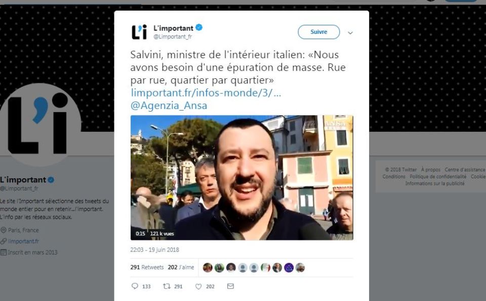 On connaît, depuis, sa politique. Les trois actes majeurs de Salvini ont été le refus d’accueillir l’Aquarius, vaisseau de centaines de réfugiés, suivi de l’appel à la chasse – pardon, au « recensement » – des Roms afin d’expulser ceux qui ne sont « pas italiens » et de tenir en laisse les autres, et tout récemment d’un appel à ratisser « chaque quartier » pour choper les réfugiés (appelés migrants) et les Roms. C’est une attaque frontale et raciste contre les libertés démocratiques, qui vise l’ensemble du prolétariat d’Italie – et d’Europe – en commençant par ses couches les plus vulnérables.