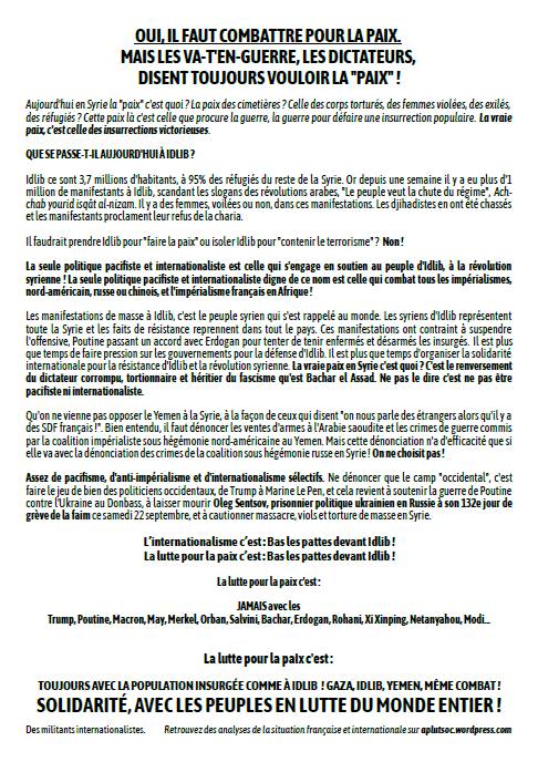 La seule politique pacifiste et internationaliste est celle qui s’engage en soutien au peuple d’Idlib, à la révolution syrienne ! La seule politique pacifiste et internationaliste digne de ce nom est celle qui combat tous les impérialismes, nord-américain, russe ou chinois, et l’impérialisme français en Afrique !