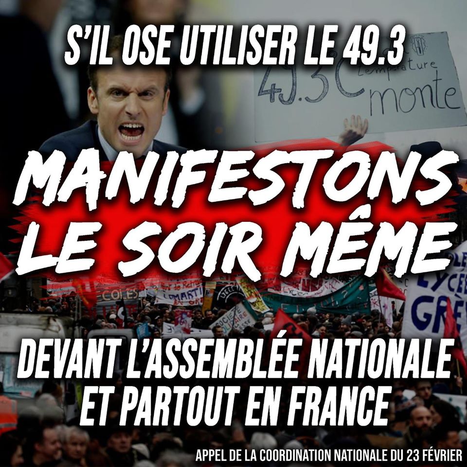 Essayons de suivre le raisonnement tordue de cette mystérieuse » coordination nationale « , annonçant qu’une espèce d’ intersyndicale francilienne, appelle demain les travailleurs à se rassembler devant l’assemblée nationale , dans le cas où le gouvernement faisait dans le 49,3.