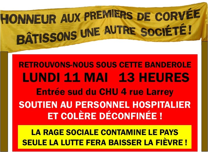 Dimanche 10 mai, dans tout le pays, de tels faits se disent, se racontent, se discutent. Demain 11 mai, des rassemblements, avec gestes protecteurs et distanciations physique (et non « gestes barrières » et « distanciation sociale », comme disent ceux d’en haut !), sont appelés devant plusieurs Centres Hospitaliers Universitaires, notamment à Toulouse à 14h à l’appel des syndicats CGT et SUD, « parce que ni la direction ni le gouvernement n’ont l’intention de satisfaire les revendications des hospitaliers », ou à Dijon à 19 h à l’appel d’un collectif local, comme dans d’autres endroits.