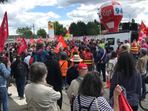 Alors, les salariés du site se lèvent avec leur Intersyndicale FO-CGC-CFDT-CGT pour dire non. Et ils n’ont pas été seuls samedi dans les rues de Choisy-le-Roi : presque deux mille manifestants regroupant aussi bien les salariés du site que les habitants de la localité et les soutiens syndicaux du Val de Marne. Les drapeaux CGT, CFDT, FO, CNT se mélangeaient aux drapeaux du PCF, de LO et d’autres, flottant à coté d’une banderole de la FI, sur la place Jean Jaurés. La CGT 94 avait fait les choses en grand avec sa camionnette, son célèbre ballon, sa sono animée par le dynamique Benjamin Amar. Philippe Martinez, secrétaire général de la CGT, a participé au cortège de bout en bout, ce qui est mieux que de signer des appels de soutien à la politique économique de Macron et Merkel (voir le Monde du 20 mai). On notait des délégations significatives des syndicats CGT du groupe Renault (Flins, Cléon, ..) Les élus locaux et départementaux prenaient la parole sur l’estrade. Même le député local LREM voulait être de la partie, c’est dire si la popularité de ce plan de casse est au plus bas sur la circonscription !