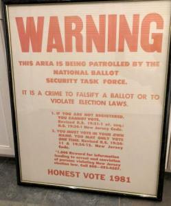 – la non-reconduction d’une mesure de justice qui avait sanctionné, en 1981, l’organisation de sortes de milices par les Républicains du New Jersey visant à dissuader les noirs et les latinos de voter.