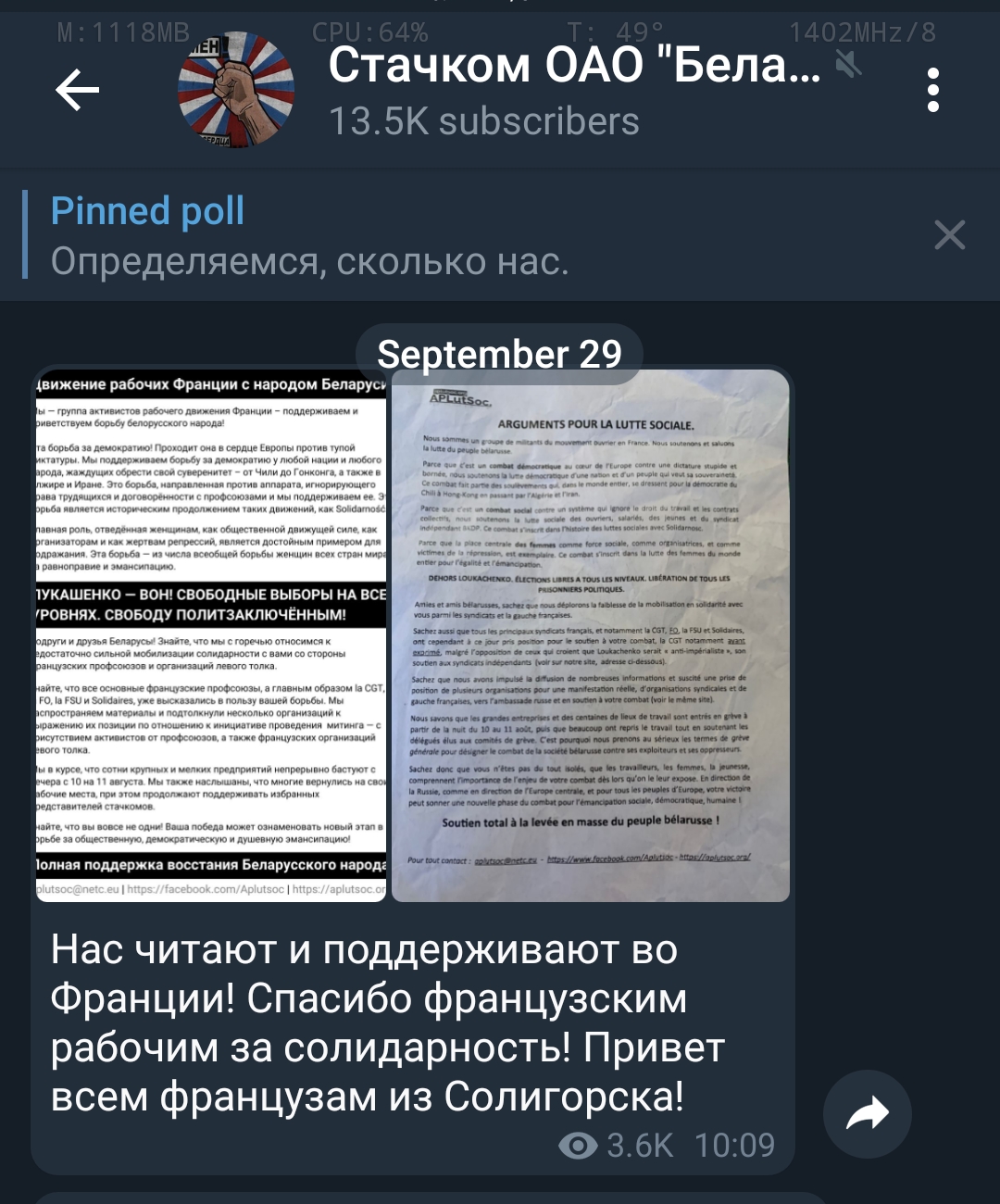 « Nous sommes lus et soutenus en France ! Merci aux travailleurs français pour leur solidarité ! Bonjour à tous les Français depuis Solihorsk ! »
