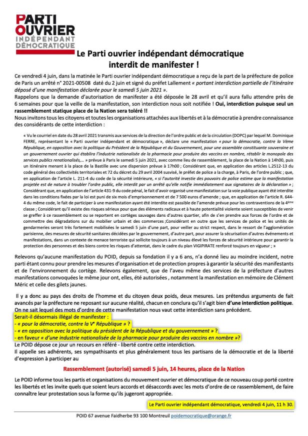 Nous publions un communiqué du POID informant de l’inadmissible interdiction de la manifesation à laquelle il appelait pour demain 5 juin, par le préfet Lallement.
