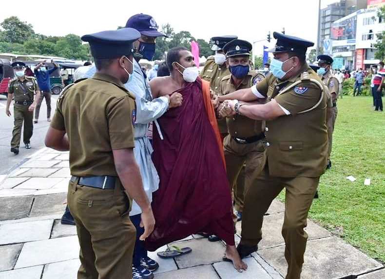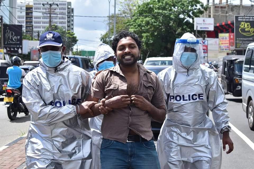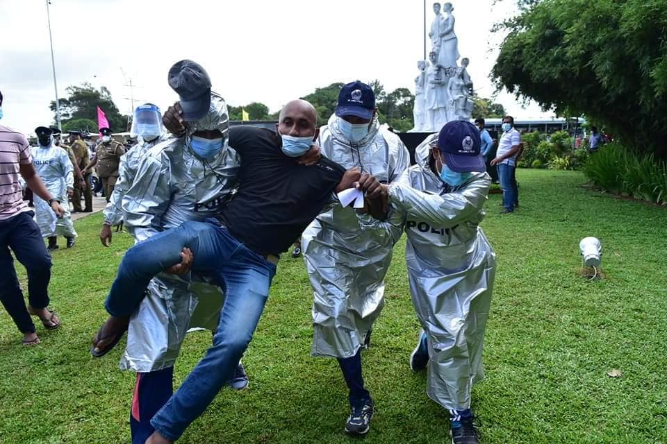 Le 7 juillet, une société d’État (la State Engineering Corporation) a mis fin aux services de 9 travailleurs pour avoir réclamé leur salaire pour le mois où ils ont travaillé et après les avoir suspendu. Deux travailleurs sont montés au sommet du bâtiment en signe de protestation et ont ensuite été contraints par la police de descendre et ont été mis en quarantaine pendant 14 jours avec le leader syndical, le Camarade Duminda Nagamuwa, qui a contesté l’élection présidentielle de 2019.