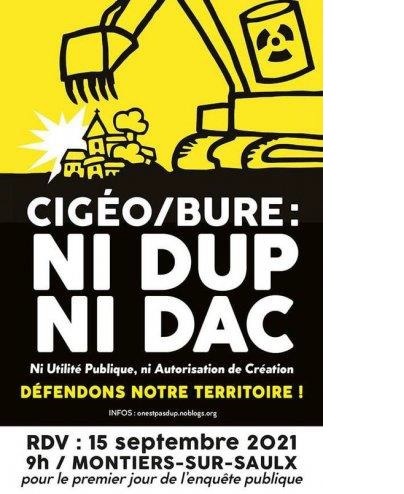 Pour le premier jour de l’enquête publique sur l’enfouissement de 85000 m3 de déchets radioactifs à haute activité et de longue durée (plusieurs centaines de milliers d’années) qui seraient stockés sous le sol de la commune de Bure à la limite de la Meuse et de la Haute Marne, un appel invitait, à la suite des mobilisations précédentes, à s’opposer au projet. Cette enquête publique s’inscrit dans les consultations factices, singeant la démocratie, qui constituent un passage obligé pour la demande de Déclaration d’utilité publique (DUP) du Centre industriel de stockage géologique (Cigéo).