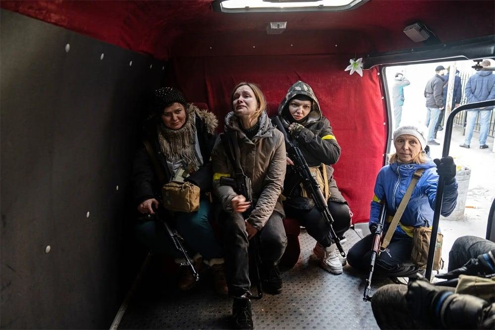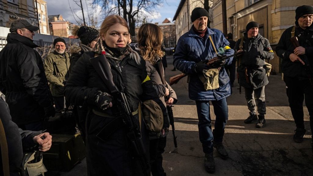 Unité d’autodéfense populaire, Kyiv,, 26/02/22.Grigory Manchur, trans, strip danceur à Kyiv, s’engage dans les groupes d’autodéfense populaire.Lesya Vorotnyk, jusque là ballerine à l’opéra national de Kyiv.