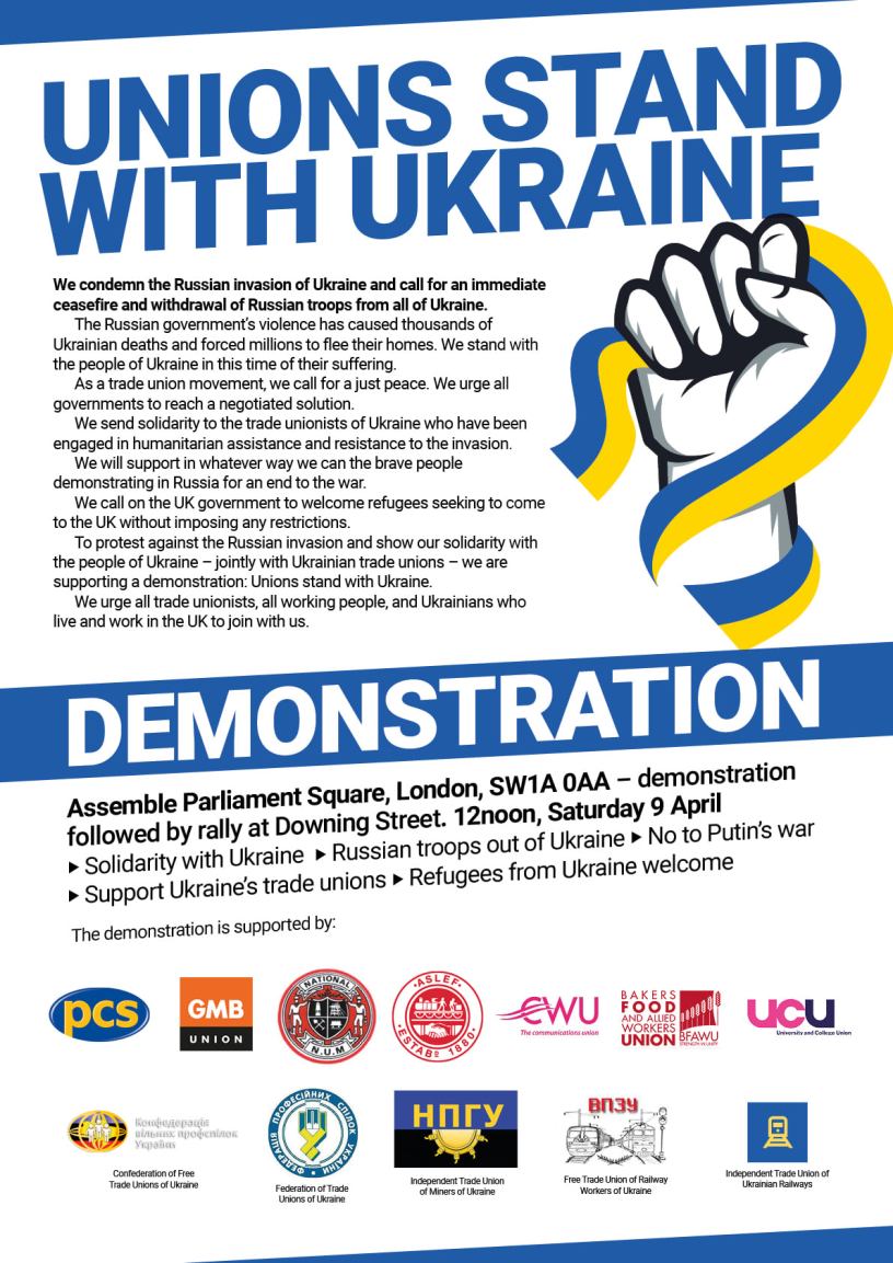 Une manifestation à partir d’un appel syndical, initié par PCS (syndicat de fonctionnaires), rejoint par GMB (fédération générale sur plusieurs champs), NUM (Mineurs), ASLEF (Conducteurs de train), CWU (Poste et télécoms), BFU (Bakers and Food – Boulangers et alimentation), UCU (Enseignants des universités), aura lieu à Londres ce samedi 9 avril à midi à partir de Parliament Square en direction de Downing Street.