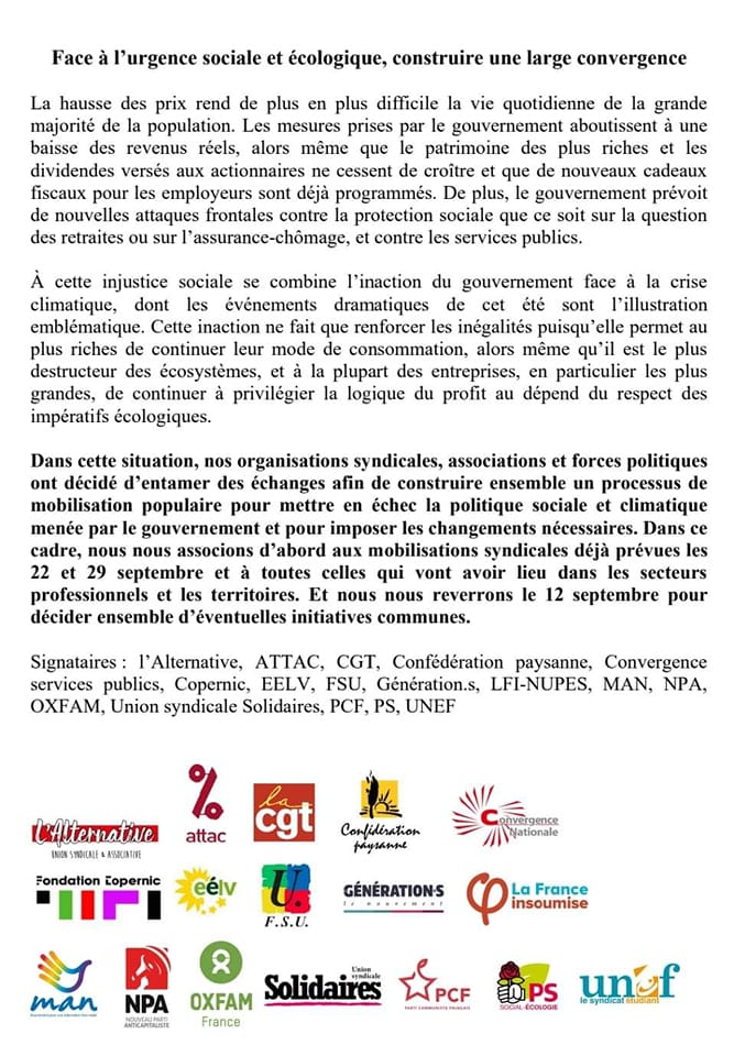 PS : Au moment où nous bouclons cet article, paraît l’appel annoncé avant la nouvelle réunion du 12 septembre – et après la mise en place du « CNR » de Macron dont il ne parle pas ! – le voici.
