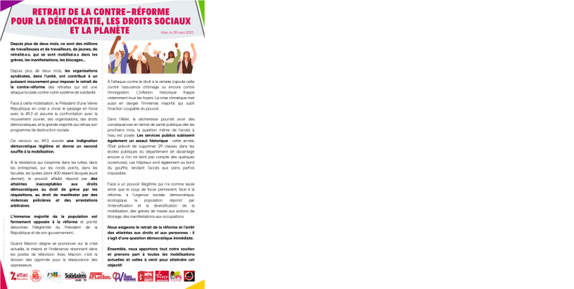 Une déclaration commune signée par les organisations suivantes du département de l’Allier : Attac Moulins, Fédération des Retraités de la Fonction Publique FGR, FSU 03, Solidaires 03, Aplutsoc, LFI 03, NPA 03, PCF 03, PS 03, UCL 03.