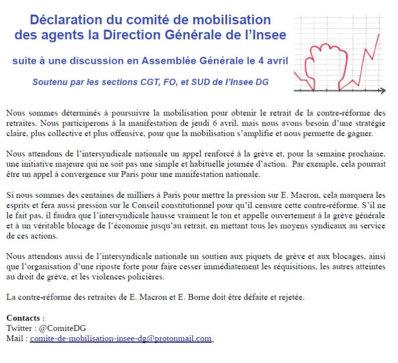 Nous faisons connaitre l’appel adopté par le Comité de mobilisation des agents de la Direction générale de l’INSEE, soutenu par les sections CGT, FO et SUD de l’INSEE DG, en faveur d’une manifestation nationale pour le retrait (cf. illustration jointe à ce post ).