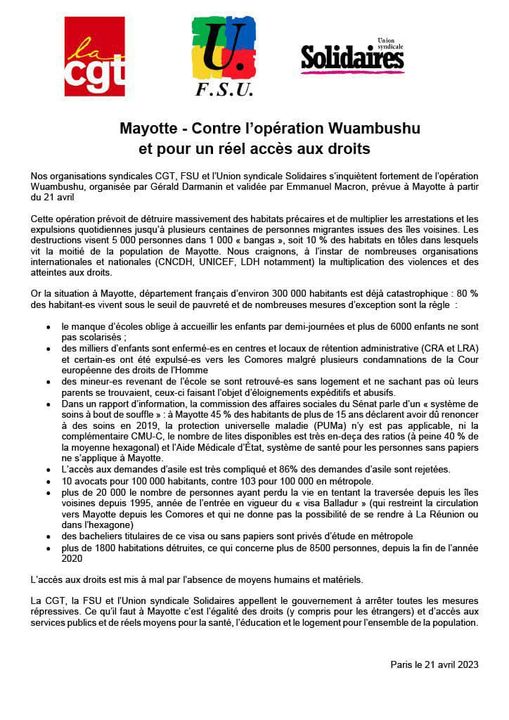 Aplutsoc est signataire d’un appel unitaire qui doit être rendu public incessamment. Ci-dessous la déclaration des centrales CGT, FSU et SUD rédigée en relation avec les sections syndicales de Mayotte :
