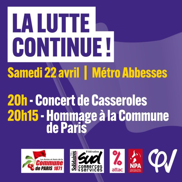 Ce samedi soir avait lieu à Paris 18ème, à l’appel de plusieurs organisations, une casserolade, devenue le moyen favori des manifestant-es pour exprimer leur réprobation de la réforme des retraites et pourrir, disons-le clairement, les gouvernants qui veulent eux faire de même avec les nôtres.