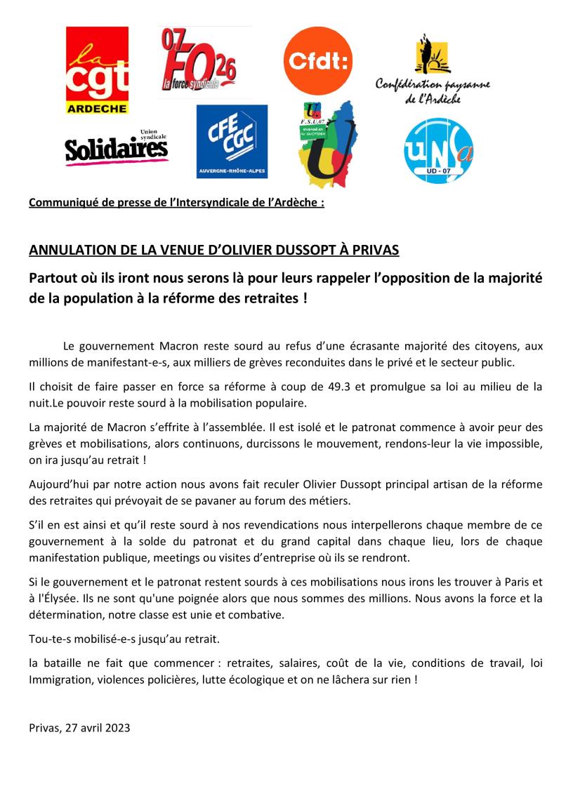 Ainsi titre l’Intersyndicale CGT – CFDT – FO – FSU – Solidaires – UNSA – CFE-CGC – Confédération Paysanne de l’Ardèche dans son communiqué en date du 27 avril. On ne peut que souhaiter la propagation de cet état d’esprit combatif et offensif partout en France en direction des responsables de la Macronie, fauteurs de régression sociale.