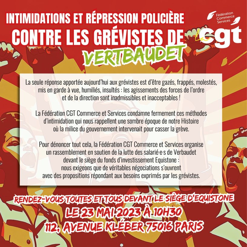 Nous relayons ci dessus l’appel de la FD Commerce et Services CGT pour un rassemblement contre les intimidations et la répression à l’égard des grévistes de Vert Baudet, devant le siège d’Equistone le fond d’investissement rapace qui rêve de faire la culbute spéculative sur le dos, au sens propre comme figuré, des ouvrières.
