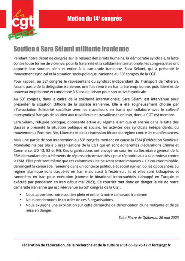 Cette motion fait suite aux événements du 53ème congrès confédéral de la CGT durant lequel les partisans de la FSM (Fédération Syndicale Mondiale à laquelle la CGT participa de 1945 à 1995 ) subirent une défaite importante face à l’exposition de la complicité active de l’organisation iranienne affiliée à la FSM, la Chambre islamique du travail, qui est une structure dépendant du ministère du Travail du régime iranien, à la répression.