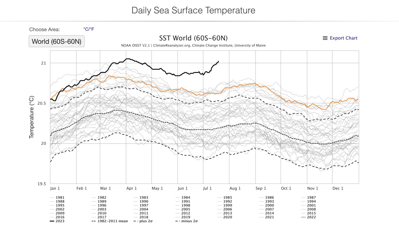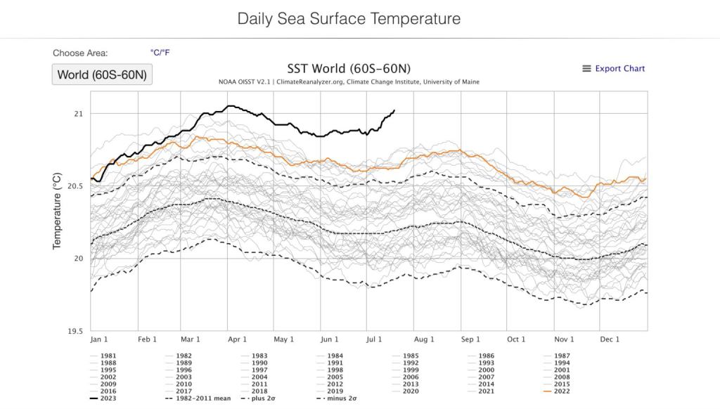 Charon n’est pas un monstre isolé. La courbe des températures terrestres de l’année en cours comparée à celle des 43 dernières années, ci-dessous, est éloquente : il y a dérapage. On ne parle pas ici d’une accélération sur plusieurs années ou de situations envisagées par les climatologues à l’échelle séculaire. Mais d’une accélération qui se mesure directement de jour en jour en ce moment même, le mois de juillet le plus chaud sur Terre depuis 100 000 ans, bien que ce soit l’hiver dans l’hémisphère Sud.
