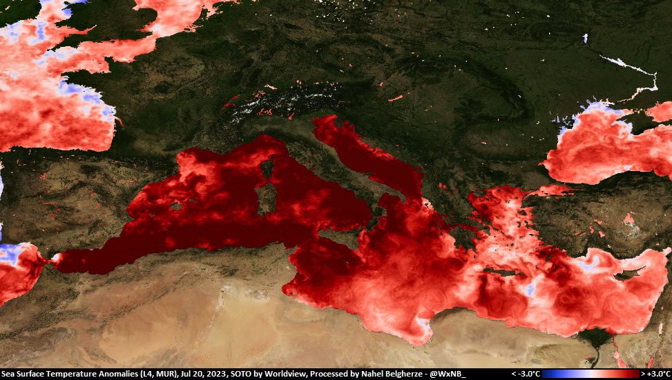 Dimanche 23 juillet, il a fait 46° en Grèce, 48° à Alger, 49° à Kairouan, et la tendance est à la hausse. Toute l’île de Rhodes flambe. « Canicule » n’est plus le terme approprié pour désigner un tel emballement. Il ne s’agit pas d’un phénomène lié au climat méditerranéen. Dans le climat méditerranéen, la masse d’air saharien, chaud et sec, se déplace vers le Nord l’été, donc sur la mer et ses côtes, conformément à la position de l’axe terrestre (et la masse d’air atlantique, jusque-là douce et humide, se déplace vers le Sud et l’Ouest, sur la même zone, l’hiver). Ce n’est pas ce qui se passe en ce moment. En ce moment, l’anticyclone d’air hyperchaud se forme directement sur la mer, sous l’effet de la surchauffe de l’eau.