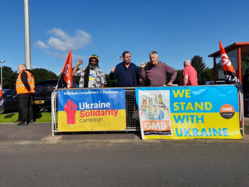L’Ukraine Solidarity Campaign Scotland s’est jointe aux membres du syndicat GMB dans une manifestation de solidarité lors de leur grève au dépôt d’équipement et de soutien militaire à Beith cette semaine.