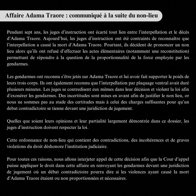 Nous reproduisons le communiqué du Comité Vérité et Justice pour Adama qui se situe sur le terrain du droit, et appuyons l’appel d’Assa Traoré à manifester le mardi 5 septembre, Place de la République à Paris.