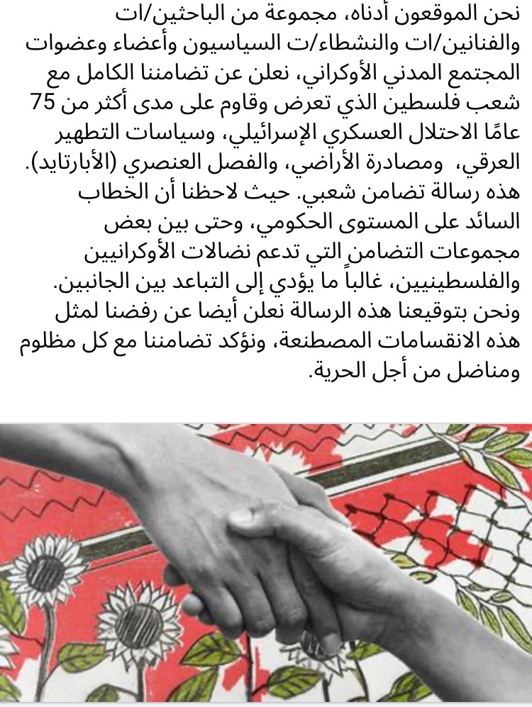 Nous, chercheurs, artistes, militants politiques et syndicaux ukrainiens, membres de la société civile, sommes solidaires du peuple de Palestine qui, depuis 75 ans, subit et résiste à l’occupation militaire israélienne, à la séparation, à la violence coloniale, au nettoyage ethnique, à la dépossession des terres et à l’apartheid. Nous écrivons cette lettre de peuple à peuple. Le discours dominant au niveau gouvernemental et même parmi les groupes de solidarité qui soutiennent les luttes des Ukrainiens et des Palestiniens crée souvent des séparations. Par cette lettre, nous rejetons ces divisions et affirmons notre solidarité avec tous ceux qui sont opprimés et qui luttent pour la liberté.
