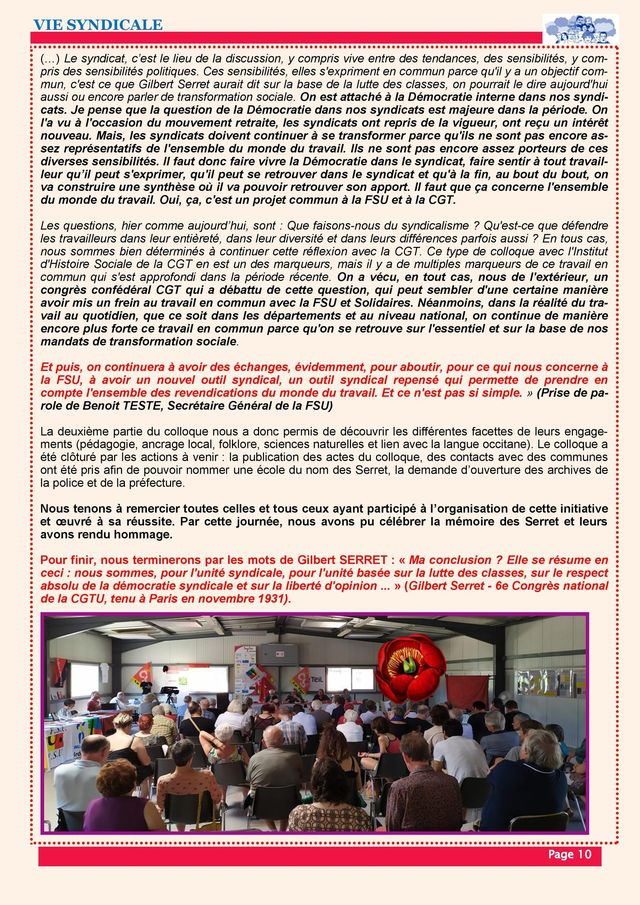 La mémoire de Gilbert Serret et de France Derrouret-Serret, de leurs camarades, et de tout ce qu’ils représentent, est indispensable au mouvement ouvrier et social d’aujourd’hui, comme un ferment. Et la réussite du colloque du 8 juillet en fut la démonstration.