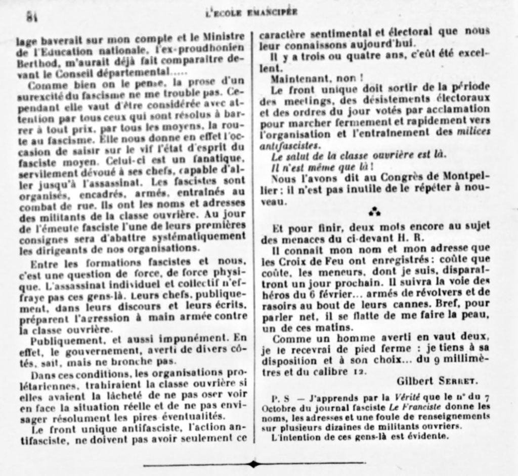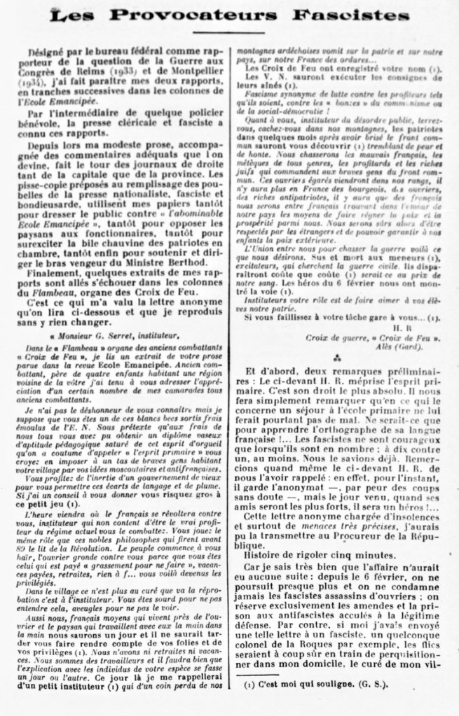 Et voici, en guise d’amuse-gueule (!), un article de Gilbert Serret sur les provocations fascistes le visant, paru dans l’Ecole Emancipée, revue syndicale et pédagogique de la Fédération Unitaire de l’Enseignement (CGTU) en 1934 :