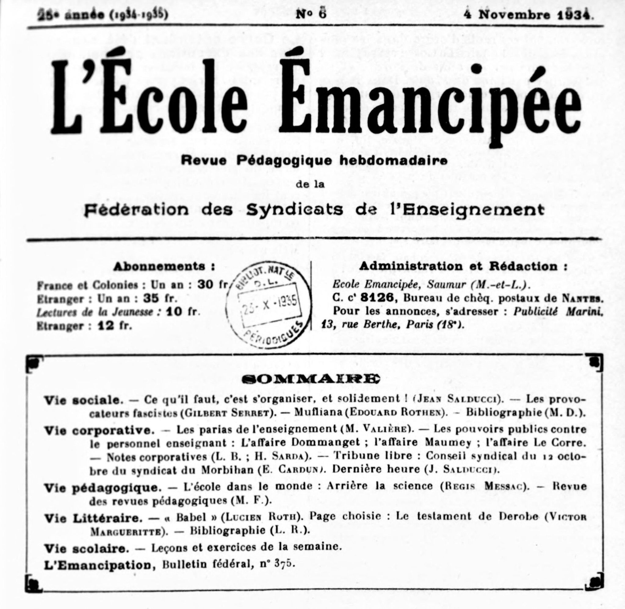 Et voici, en guise d’amuse-gueule (!), un article de Gilbert Serret sur les provocations fascistes le visant, paru dans l’Ecole Emancipée, revue syndicale et pédagogique de la Fédération Unitaire de l’Enseignement (CGTU) en 1934 :