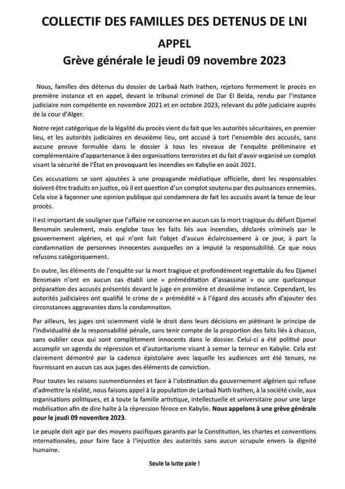 Comme l’UGTA est inféodée au FLN ou que les structures locales de celle-ci qui s’étaient mobilisées contre la dernière réforme judiciaire du gouvernement ont été réprimées ou recentrées, comme les autres organisations syndicales autonomes ont été réprimées voir dissoutes par le pouvoir, cela peut expliquer le caractère hors cadre syndical de cet appel à la grève générale contre la répression.