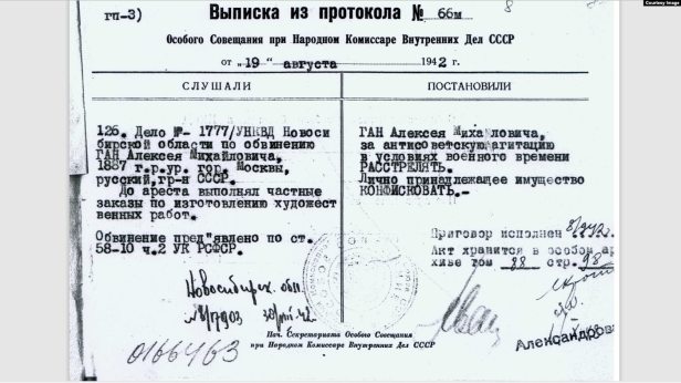 L’« extrait » et quelques autres documents du cas d’Alexei Gan ont été publiés sur le site Internet du musée de Tomsk « Prison d’investigation du NKVD ». On ne sait pas exactement où sont enterrées les restes d’Alexeï Gan, l’une des figures clés du constructivisme soviétique. Comme l’a déclaré à Sibir.Realii Alexandre Roudnitski , qui a dirigé le centre Mémorial de Novossibirsk pendant de nombreuses années, il existait un décret selon lequel les » ennemis du peuple » exécutés étaient enterrés en secret, sans laisser de traces sur les lieux de sépulture.