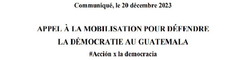 Communiqué commun du 20 décembre 2023 signé par le Collectif Guatemala, France Amérique Latine (FAL), Festivales solidarios et le Collectif de Solidarité avec le Peuple du Nicaragua (CSPN) portant sur les échéances électorales et institutionnelles dans ce petit pays d’Amérique centrale où les forces réactionnaires se mobilisent alors que le nouveau président démocratiquement élu devrait prêter serment le 14 janvier prochain.