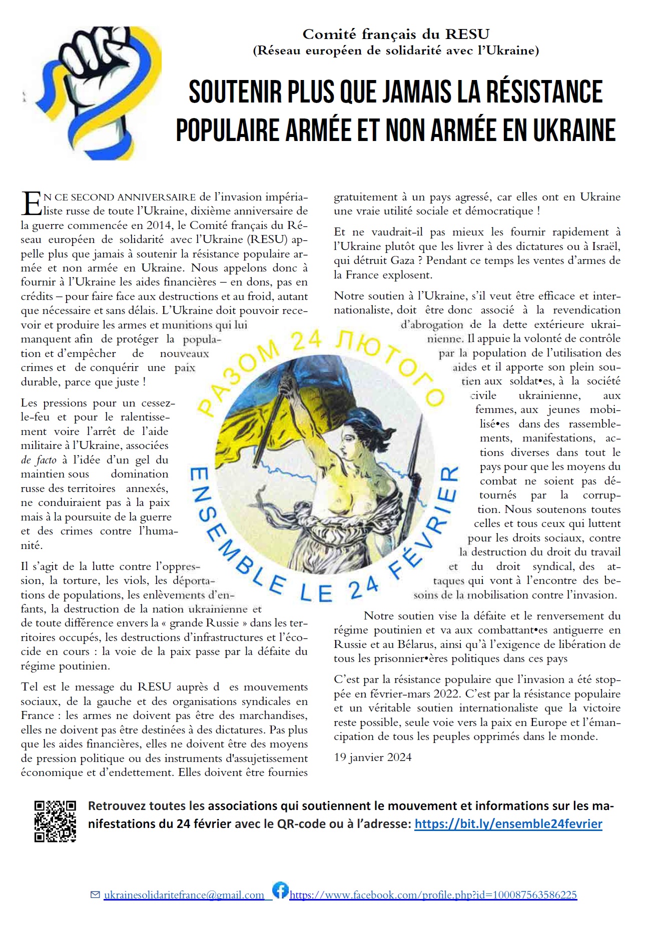 En France, l’Union des Ukrainiens de France et d’autres associations ont lancé un appel à manifester le 24 février. Le Comité français du RESU, le Réseau Européen de Solidarité avec l’Ukraine, participe à la préparation de la manifestation parisienne et aux initiatives lyonnaise et niçoise, notamment, et a adopté son propre appel sur une ligne explicitement internationaliste, que nous reproduisons ci-dessous.