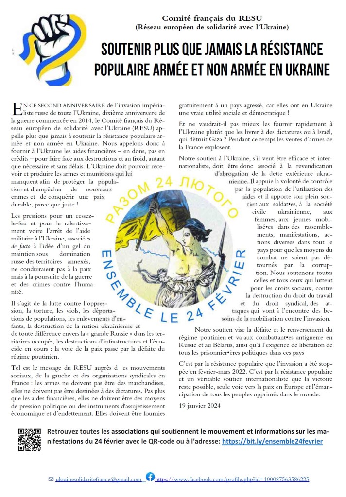Point très important, et résultat du combat du RESU : comme au printemps dernier (où FO, sous la pression des partisans de l’union sacrée pour un cessez-le-feu poutinien, avait retiré sa signature au dernier moment), l’intersyndicale formée contre l’attaque de Macron sur les retraites avait pris position pour la défense du peuple ukrainien, sans aborder la question de son armement. Malgré cette limite évidente, cette prise de position syndicale unitaire est un point d’appui essentiel pour matérialiser la solidarité internationaliste, dont les associations ukrainiennes comprennent la portée. Et l’appel du RESU fournit un argumentaire sur la question des armes et comment la soulever d’une manière internationaliste, indépendante de tout gouvernement capitaliste.