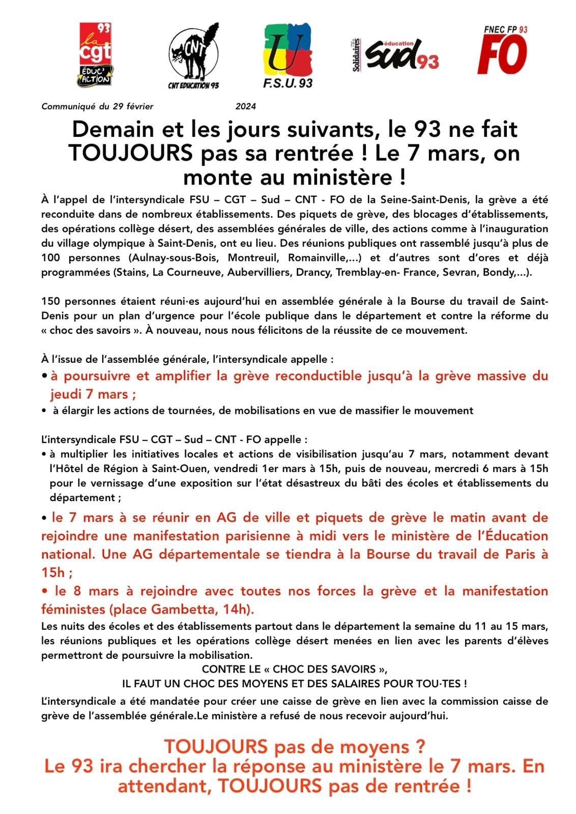 Le 22 février, en pleines vacances, 4 syndicats du département le plus pauvre de France métropolitaine, la Seine-Saint-Denis (le 93), FSU, CGT, SUD et CNT, décidaient d’appeler à la grève à la rentrée, concrétisant des discussions qui s’étaient produites dans beaucoup de réunions d’établissement juste avant les vacances.