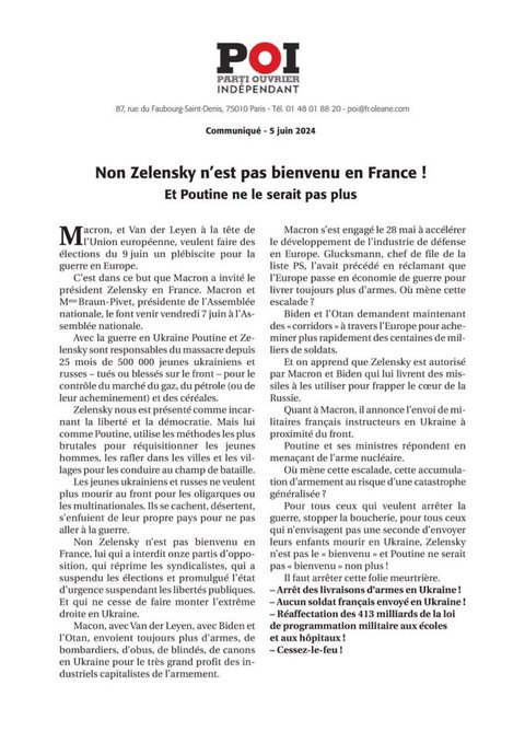 Document : le communiqué doublement social-impérialiste du POI, venant au secours conjointement de Poutine et de Macron.