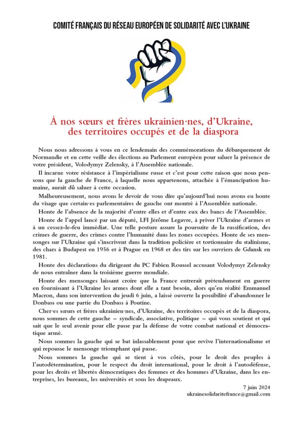 À nos sœurs et frères ukrainien·nes, d’Ukraine, des territoires occupés et de la diaspora – Communiqué de presse du RESU du 7 juin 2024 en réponse à l’attitude de certains parlementaires à l’occasion de la visite du président Zelensky
