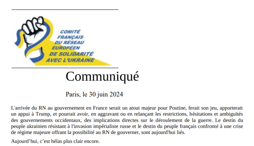 Le Comité français du Réseau européen de solidarité avec l’Ukraine affirme que la défense de l’Ukraine et le combat pour empêcher le RN d’accéder au pouvoir en France sont liés.