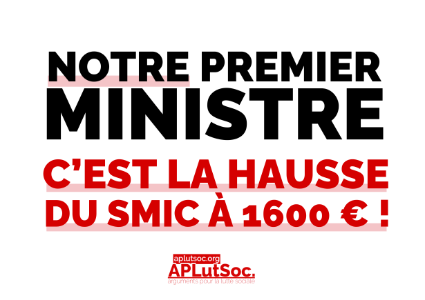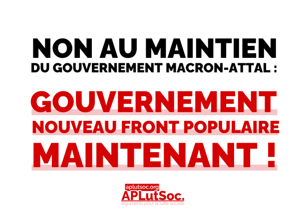 La rédaction d’Aplutsoc (Arguments Pour la Lutte Sociale) a produit quelques affichettes que nous vous proposons de faire circuler dans votre entourage ou milieu social ou militant pour mettre la pression pour obtenir le départ immédiat du gouvernement Attal, l’installation d’un gouvernement du Nouveau Front Populaire pour abroger la loi Macron des 64 ans, la réforme de l’assurance chômage, pour obtenir la libération immédiate des militants kanaks emprisonnés, pour garantir les libertés de manifester et d’expression pour les mobilisations anti-bassines des 19 et 20 juillet prochain, pour la hausse du SMIC à 1600 euros net.