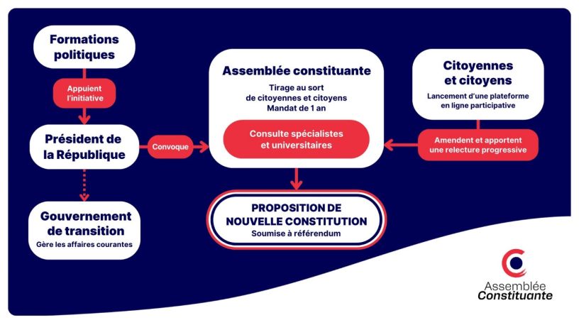 3) Prenons la photo qui sert d’illustration au site et placée en tête de mon article. Un gouvernement de transition gère les affaires courantes sous l’autorité du président de la République, Macron. Gérer les affaires courantes signifie continuer les contre-réformes en cours. Le président de la République, Macron bien sûr, convoque l’Assemblée Constituante. Les citoyens doivent se contenter d’ « irriguer par des contributions populaires recueillies sur une plateforme participative en ligne. »