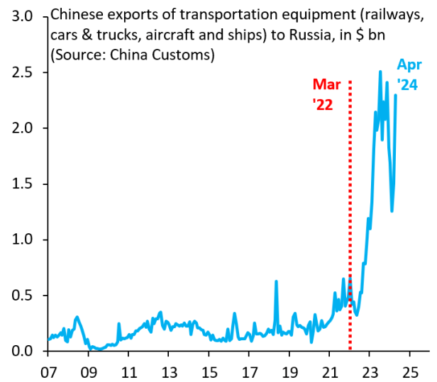 D’autre part, et surtout, c’est la structure des échanges internationaux qui, dans le processus de fragmentation mondialisée en cours, a changé depuis deux ans. Je remets ici un schéma déjà utilisé dans un article sur Aplutsoc en février, indiquant non pas la baisse, mais bien l’effondrement, des investissements de capitaux américains, européens, japonais et sud-coréen en Chine depuis 2022 (seule exception, l’Allemagne), que complétera un second schéma, d’origine chinoise, concernant l’explosion des exportations chinoises en Russie :