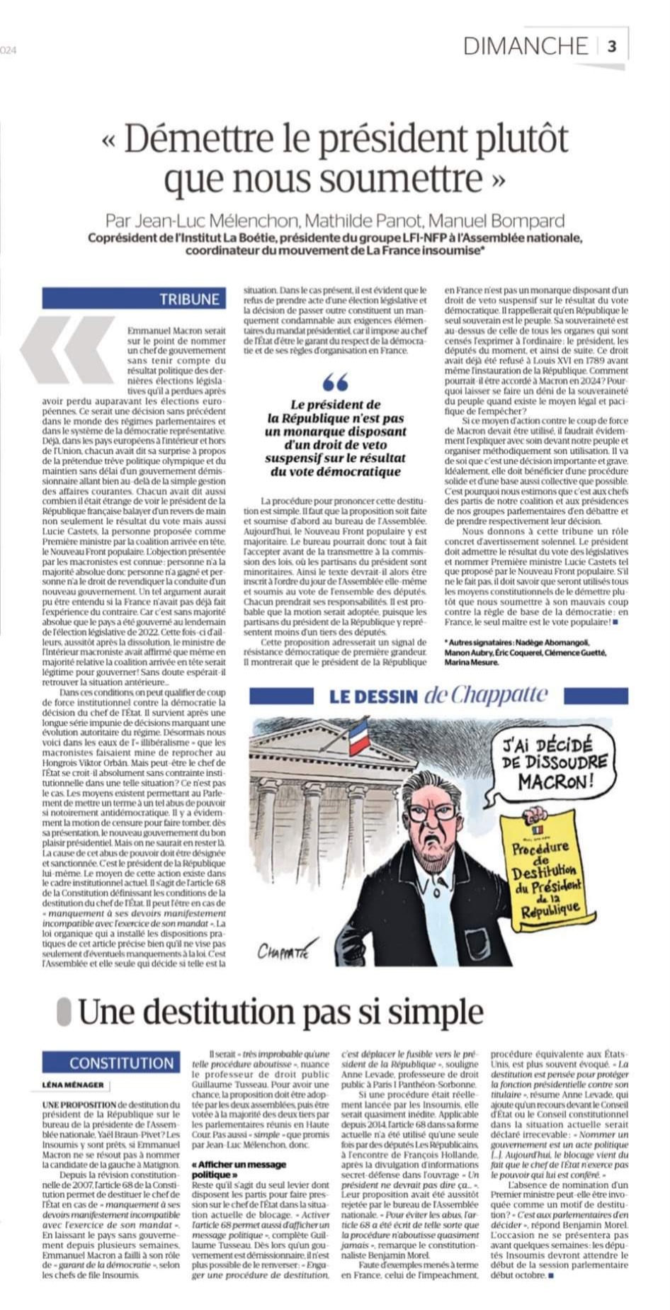 On peut lire la proposition LFI de destitution.du Président de la République, irréaliste au plan pratique, de plusieurs manières :