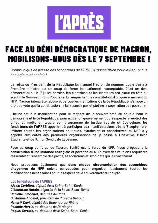 On note aussi, du côté des associations, la décision d’Attac d’appeler au 07 septembre et parmi les forces politiques du NFP, le communiqué des fondateurs de l’APRES.