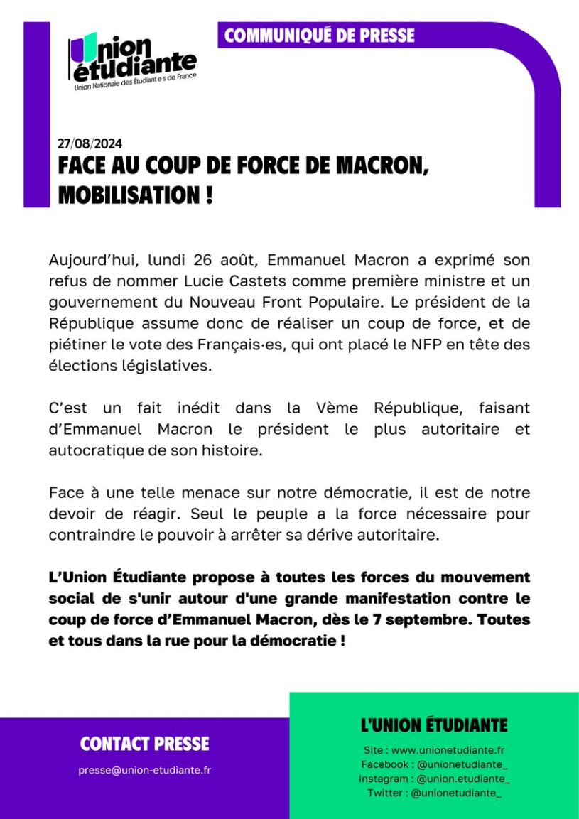 Il est important pour le mouvement syndical tout autant que pour la gauche de se mobiliser pour contrer le coup de force de Macron qui, depuis bientôt deux mois, refuse de nommer un gouvernement du Nouveau Front Populaire (NFP), coalition sortie en tête du scrutin du 7 juillet.