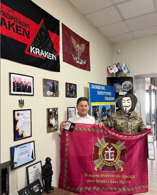 Le jour du drapeau national, un représentant de la 54e brigade mécanisée distincte du nom de l’hetman Ivan Mazepa [un hetman des cosaques d’Ukraine] a visité le bureau central du KVPU, avec qui le chef adjoint de l’organisation municipale de Kyiv du KVPU, le chef de l’organisation principale de « Protection de la justice » maintiennent un contact constant et, aussi avec des volontaires [soldats] syndicaux.