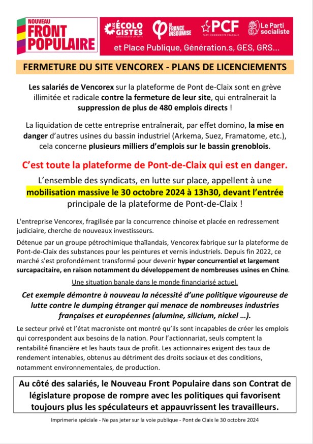 Une manifestation de soutien de la population se tient ce mercredi 30 octobre. Surprise : un tract du NFP (Nouveau Front Populaire)38, co-signé par les organisations Écologistes, La France Insoumise, PCF, PS et Place publique, Génération.s etc… est diffusé. Là où la bataille sociale s’engage le NFP renaît et dépasse ses contradictions internes.