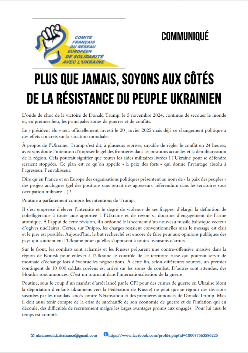 Communiqué du RESU du 30 novembre 2024 : plus que jamais, soyons aux côtés de la résistance du peuple ukrainien !