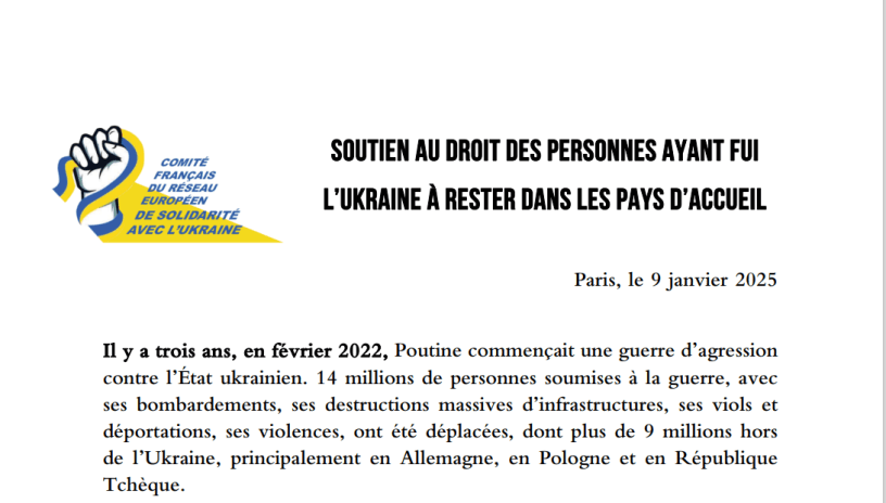 Soutien au droit des personnes ayant fui l’Ukraine à rester dans les pays d’accueil. Communiqué RESU du 09 janvier 2025.