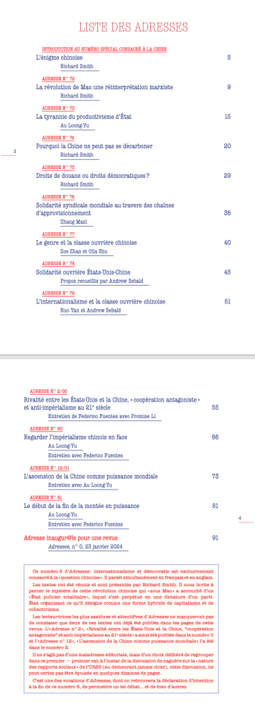 Le numéro 8 de la revue Adresses : internationalisme et démocratie est exclusivement consacré à la « question chinoise ». Il paraît simultanément en français et en anglais.