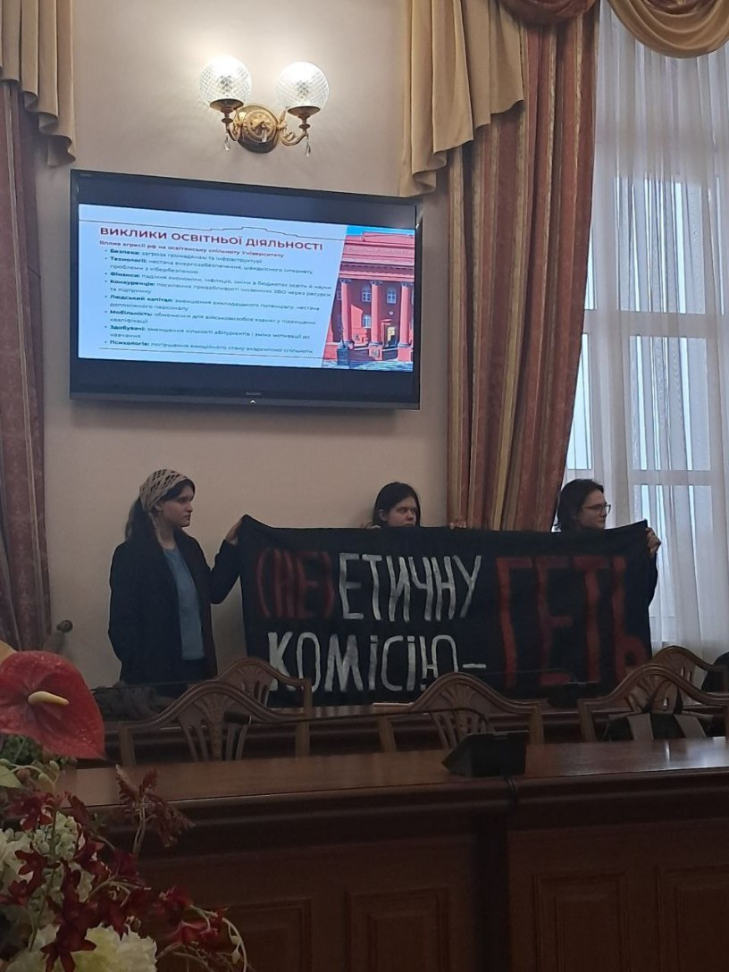 Aujourd’hui, des activistes du syndicat Priama Diia sont venus à la réunion de l’administration de l’université pour une petite mais importante action. Nous avons protesté contre les activités de la Commission d’éthique du KNU, en particulier sa décision dans l’affaire Savchuk [Maryna Kalachnikova, étudiante, avait quelques jours auparavant dénoncé en vain le harcèlement du professeur Oleksiy Savchuk], qui a montré une fois de plus l’incapacité de cette structure à protéger les droits des étudiants.